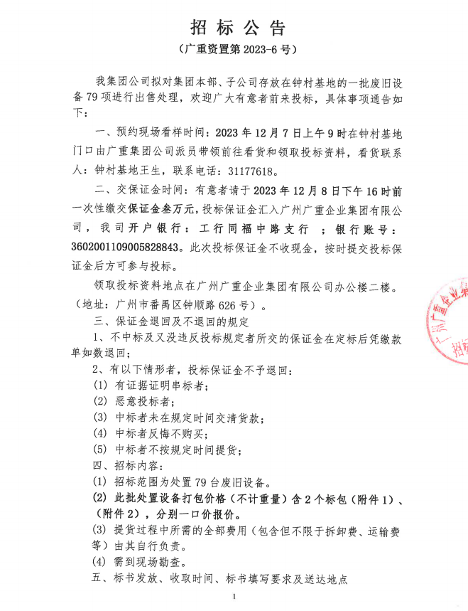 廣重集團(tuán)本部及子公司79臺(tái)廢舊設(shè)備資產(chǎn)處置(廣重資置2023-6號(hào))